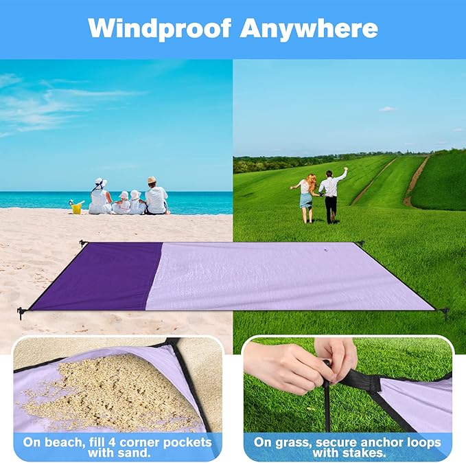 - 【Sand Resistance & Windproof】Outdoor beach blanket is sand proof and quick drying. Just shake it gently, the sand slips off easily. Comes with 4 lager corner sand pockets, 4 anchor loops and 4 pieces ABS stakes. Secure blanket on beach / grass with sand and stakes to prevent blanket blowing away on windy days.