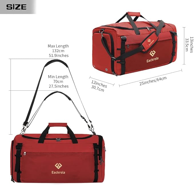- LARGE DUFFEL:25 x 13 x 12 Inches, 65L, enough space for personal exchange clothes for domestic and international travel as well, you can use it as a sports gym bag, a carry on bag, a travel bag and a daily bag, perfect for workout, rides, gym, yoga, beach, pool, camping, practice days or weekend trips.