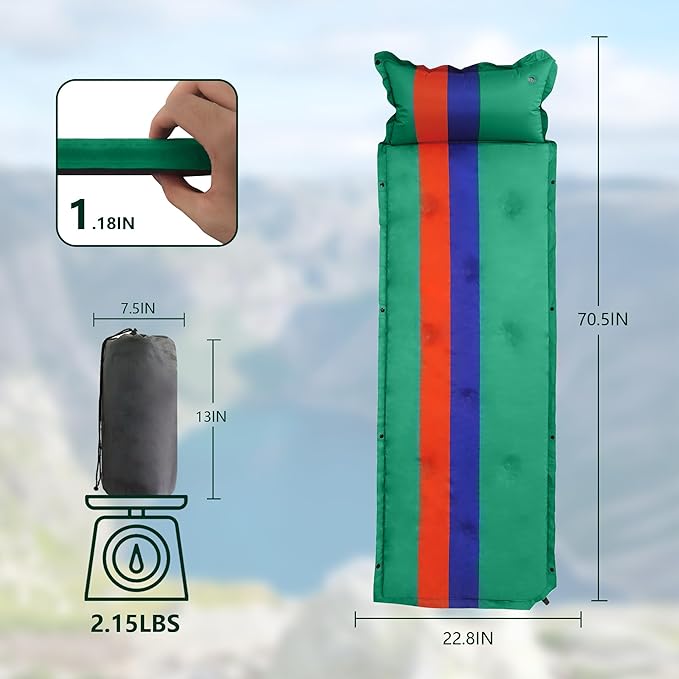 - 🌻【Lightweight & Portable】Introducing our camping sleeping pads, crafted with high-quality polyester for optimal comfort and durability.At 70.5" * 22.8" * 1.18" when fully inflated, it offers ample space for a cozy night's rest.Whether you're embarking on a thrilling backpacking adventure or need an extra sleeping solution for guests at home, our versatile and portable sleeping pad is the perfect companion.