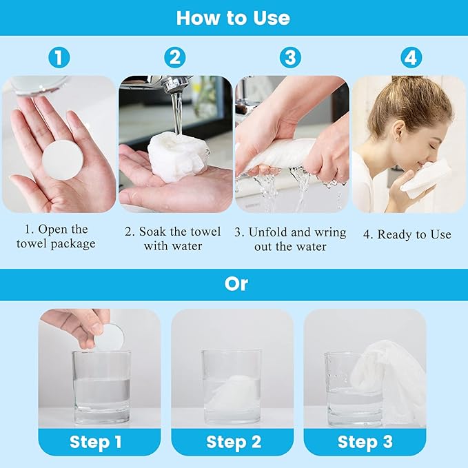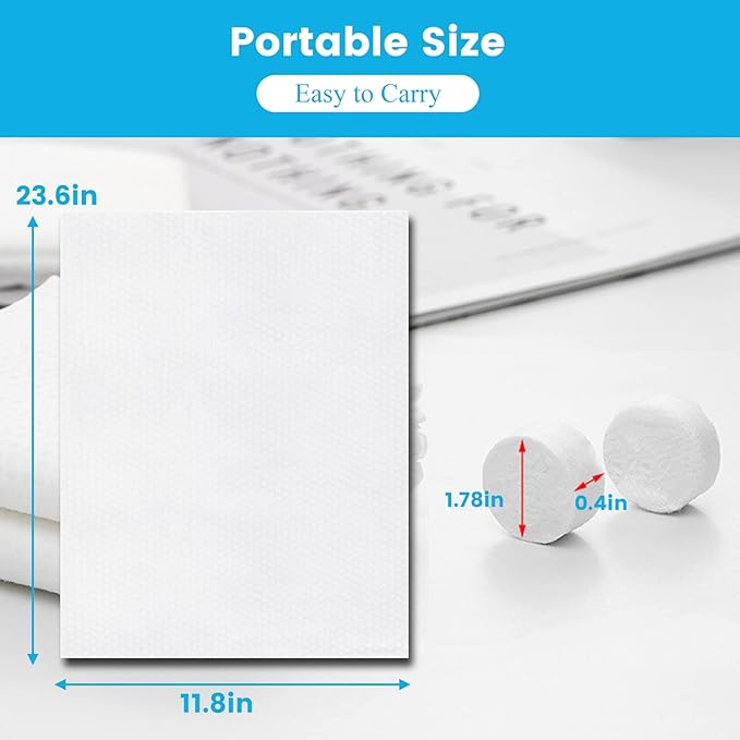 - 【Mini Towels】:Compressed towels tablets size is 0.8 x 0.3 inch (2 x 0.8cm) approx. Expanded size is 7.8 x 8.6 inch (20 x 22 cm). Easy to carry and space saving. Just add a little amount of water, unfold in seconds.