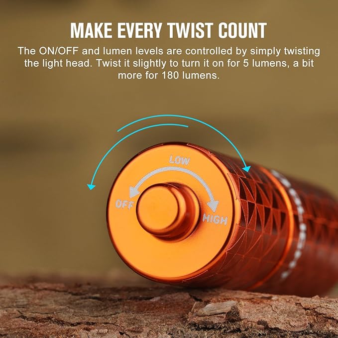 - [Easy to Operate] Switching with a simple twist of its head. Twist it slightly to turn it on for 5 lumens, a bit more for 180 lumens