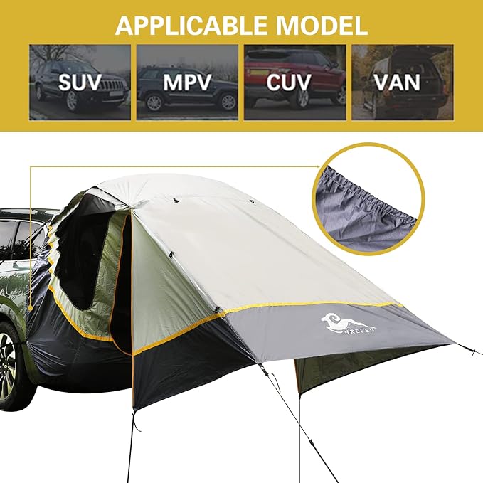 - 【Universal for any size of SUV】This tailgate tent attaches to the rear of any size SUV, Van, CUV, MPV with its elastic universal fit design. Not suitable for cars with double doors, side doors, and tires on the back.Because it is a universal size, there may be some differences in used for different car models. It may be compact or there may be have some space, but they can all be used normally;