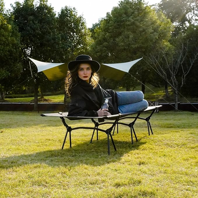 - 🏕️ 【Lightweight but High-strength Aluminum Cot for Camping】 Built with Aircraft-grade 7075 aluminum bars and brackets make it only weigh 6.6 Lbs/ 3kg. It is so light even for little girls. But the frame strongly support the camp cot from overturning while sitting and sleeping, sturdy and stable enough to support up to 330 lbs (150kg), also a solid camp cot for heavy people.