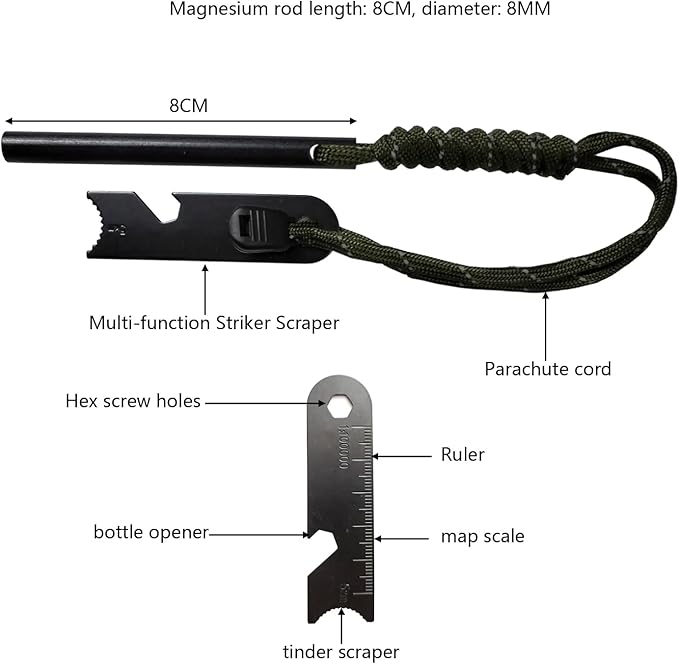 - The magnesium rod is 3.15 "(8CM) long and 8MM in diameter. Contains a multifunctional metal scraper. A set weighs 50 g.