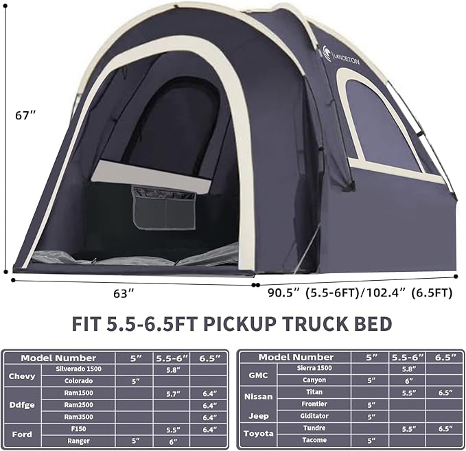 - 【Compatibility】 The truck bed tent will fit for pickup truck with 5.5-6 ft bed. Compatible with F150, Ram, Silverado, Tundra, Sierra, Titan etc.
