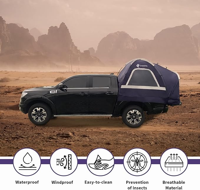- 【Easy-to-Clean Waterproof Fabric】Crafted from high-density polyester oxford with a PU3000 water-proof coating, the Lanceton Pickup Truck Tent ensures superior rainproof and waterproof performance The tent features a waterproof layer on the bottom to prevent rainwater infiltration. It can be placed with an air-filled bed, ensuring that the inner space remains clean and dry. With advanced easy-to-clean technology, a simple soap wash after your camping trip will make it look as good as new.