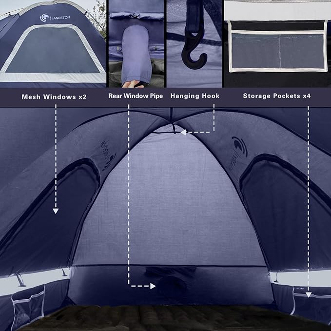 - 【Unique Rear Window Pipe】Introducing Lanceton's proprietary design - a special ventilation pipe of 8 inches in diameter located in the front of the pickup truck tent. This pipe allows access through the rear window of your truck, connecting the two spaces seamlessly. Pass items between the truck and the tent effortlessly and enjoy the convenience of using the power plug from the truck while resting in the tent.