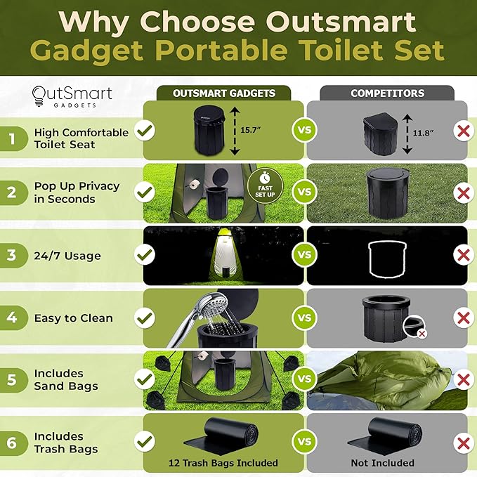 - 【All in One Portable Outside Toilet Set】Convenient for both new and professional campers of all ages, this toilet camping set includes a durable foldable toilet with a secure lid latch, 6ft 2in privacy tent, LED camping lantern (AA batteries not included), 8 ropes and stakes (4 extra included for backup), toilet trash bags, and 2 carry bags.