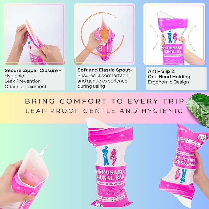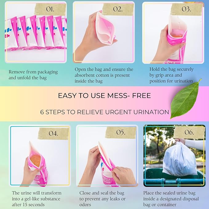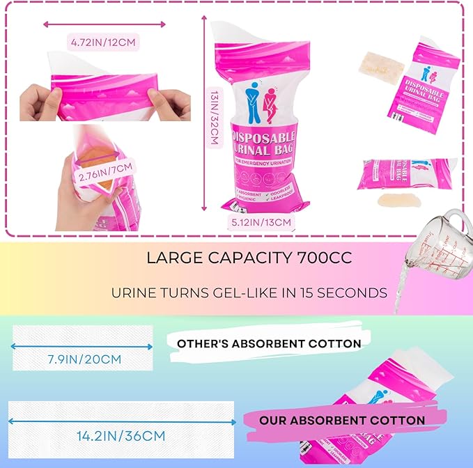 - Instantly absorb liquid within 60 Seconds - The disposal urinal bag is equipped with an extra-large water-absorbing polymer that can absorb urine, vomit, or other liquid waste and turns it into odorless, spill-proof gel within 60 seconds.