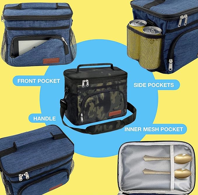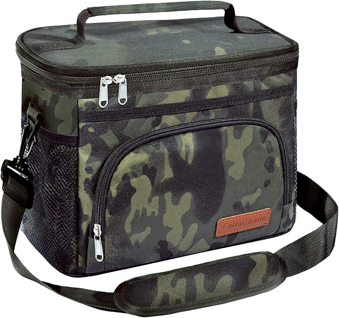 ExtraCharm Insulated Lunch Bag for Women/Men - Reusable Lunch Box for Office Picnic Hiking Beach - Leakproof Cooler Tote Bag Organizer with Adjustable Shoulder Strap for Adults-Black Camo