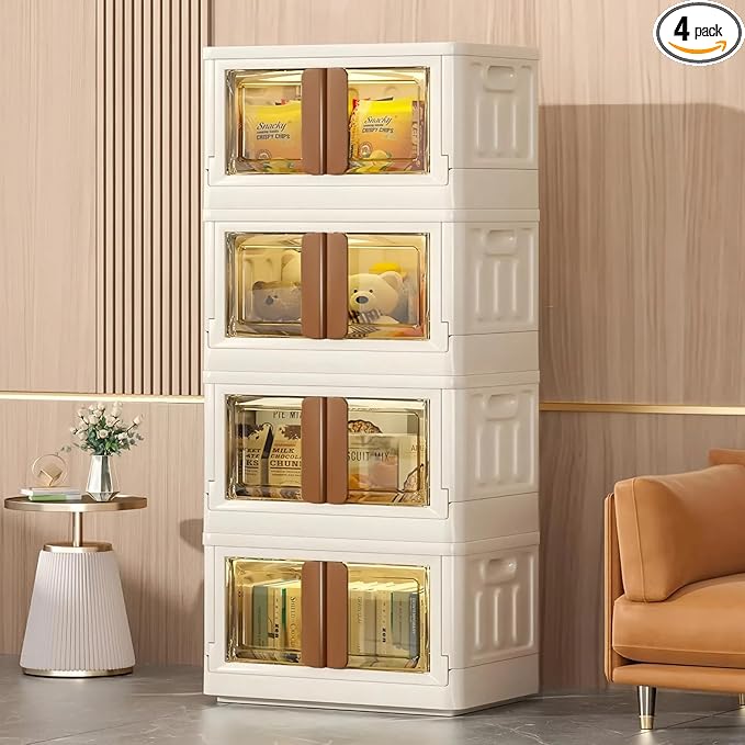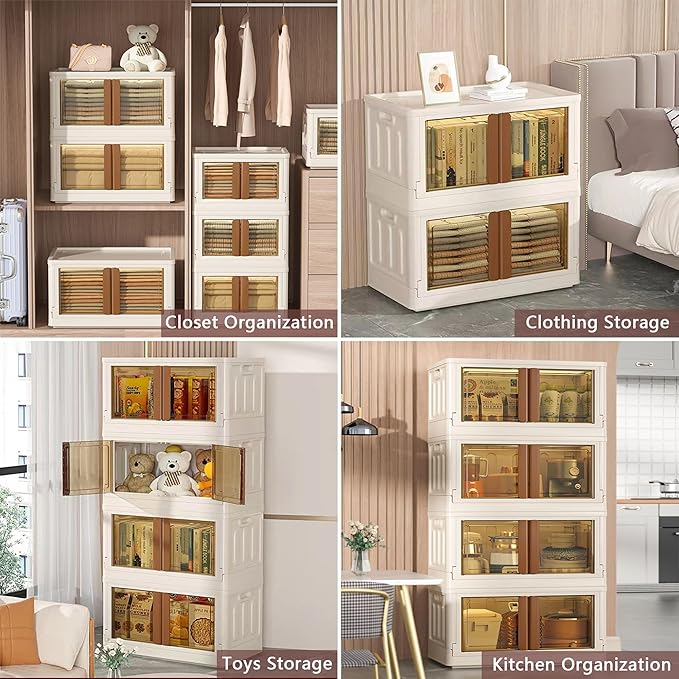 8.4Gal Collapsible Storage Bins with Lids & Wheels - 4 Pack Stackable with Doors, Heavy-Duty Plastic Containers for Home/Office, Milk White
