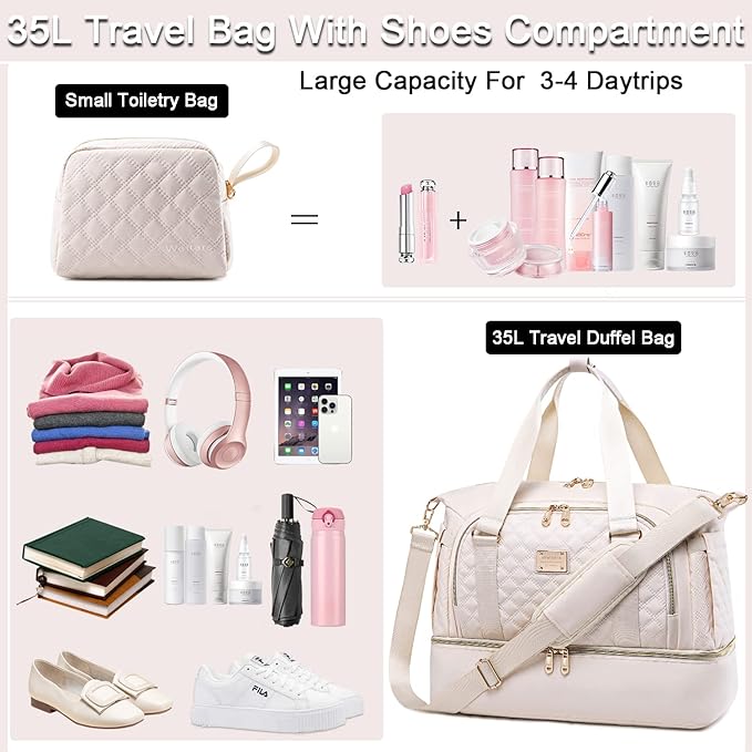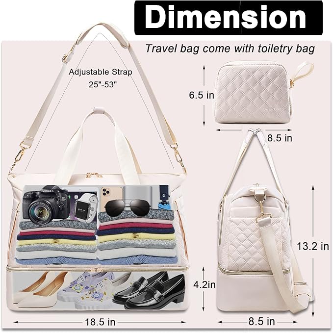 - 【Large Weekender Bag With Multi-Pockets】The Weekender Bag For Women Measure By L18.5"X W8.5"X H13.2",With Capacity Of 35L. Separated Upper And Down Compartments That Can Fit Daily Necessities For 3-5 Days,Such As Clothes,Shoes,Books,Bottles,Toiletries, Etc.The External Multi-Pocket Design Allows For Easy Organization And Access To Your Belongings,A Back Pocket For Personal Items Such As Your Phone And Wallet.Additionally,It Comes With A Toiletry Bag To Conveniently Store Your Toiletries.
