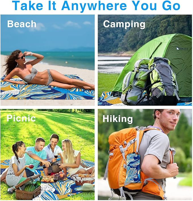 - 🌊Oversized But Compact: The 79"× 83" size beach / picnic blanket comfortably fit 4-6 adults sitting or 4 adults lying. It is the best choice for family and friends gathering. And it is easy to fold into a compact size(7.87"x3.93"), 0.73 lbs, so you can easily carry it for anywhere!