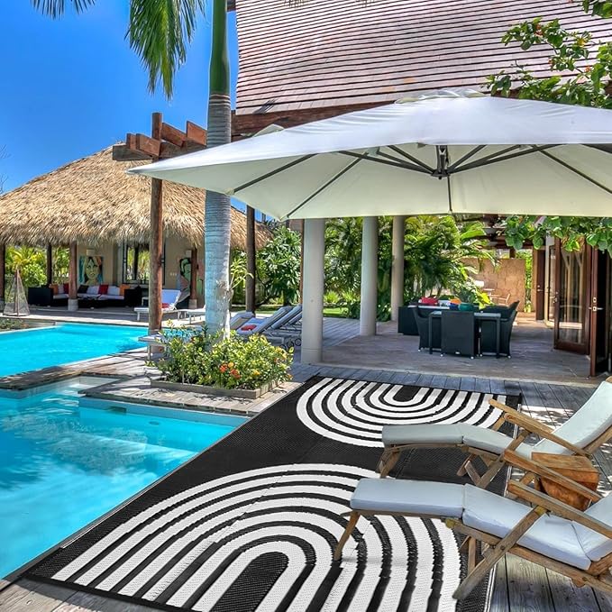 - Unique Design: Our outdoor rug features a double rainbow pattern, simple and classic black and white design, easily match any of your patio furniture and outdoor space, complement your modern style. The reversible design gives two looks, and when one side of your rug wears down, just flip it over and it'll give your patio a whole new look. (Note: There may be some creases when first used, simply unfold the rug and lay it flat or press it with heavy object and it will recover flat completely.)