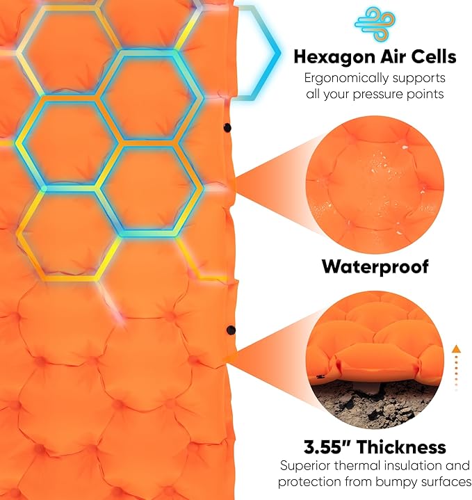 - REJUVENATE YOUR BODY: Powerlix upgraded camping pad has revolutionary design made with body mapping technology. The hexagon air cells ergonomically support all of your pressure points, giving you superior support and comfort all night long, no matter how you sleep! The sleeping mat is also a camping gear must haves luxury, being comfortable yet lightweight. It rolls up small, making it effortless to carry around. It is sure to match anyone's personality.