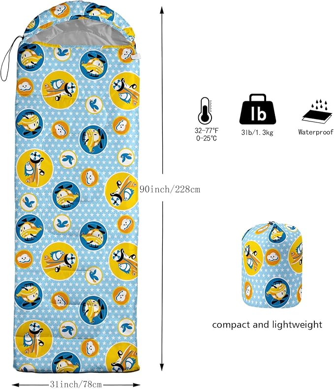 - SUITABLE:The sleeping bag can be used for 3 Seasons.SIZE:90.5"L x 31.5"W Suggenal extreme temperature: 41 ℉ -77 ℉.Applicable in a variety of scenarios,such as Travel camping pajamas party,It's very suitable for you to travel with your children.Half-circle hood with adjustable drawstring,which can keep you warm and prevent your humidity