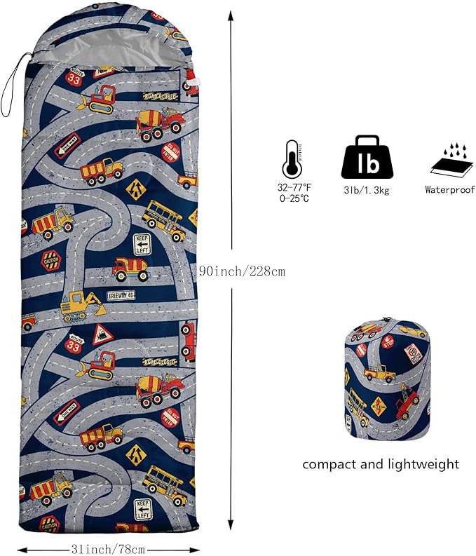 - SUITABLE:The sleeping bag can be used for 3 Seasons.SIZE:90.5"L x 31.5"W Suggenal extreme temperature: 41 ℉ -77 ℉.Applicable in a variety of scenarios,such as Travel camping pajamas party,It's very suitable for you to travel with your children.Half-circle hood with adjustable drawstring,which can keep you warm and prevent your humidity