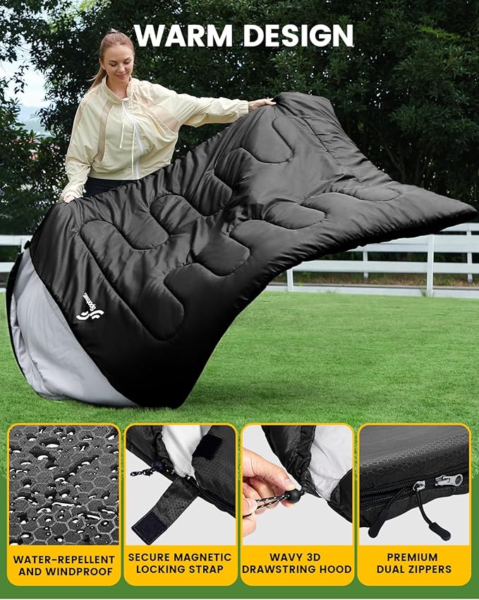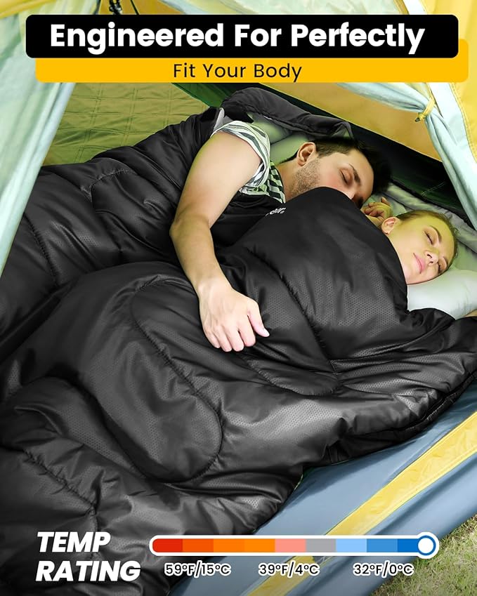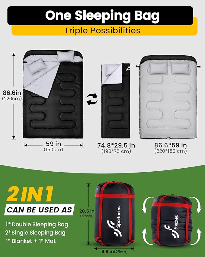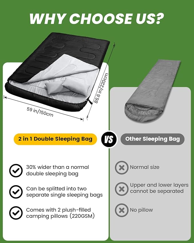 - Versatile Camping Sleeping Bag: Our double sleeping bag features a wrap-around zipper design with two pillows, providing warmth and comfort for a variety of scenarios, also enabling you to split the sleeping bag into two separate single sleeping bag or two queen-sized blankets. Whether camping, hiking, or traveling, our adults sleeping bag is a camping essential for outdoor enthusiasts and travelers. Buy this 2 in 1 double sleeping bag, be close to the nature world!