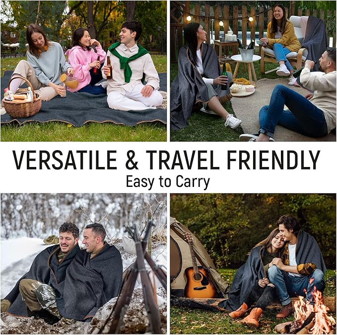 • 🛖【MULTI-USE WOOL BLANKET - HOME TO CAMPSITE】 This versatile Wool Blanket serves multiple purposes: Car Blanket, Picnic Blanket, fire pit companion, indoor fireplace comfort, and Camping Blanket. Perfect for cozy nights at home or outdoor adventures, it offers comfort and warmth while meeting military-grade durability standards.