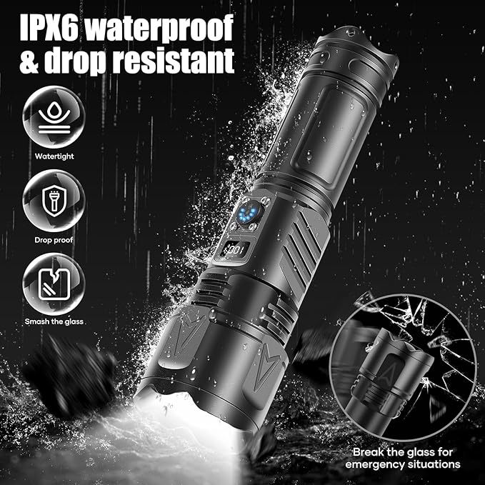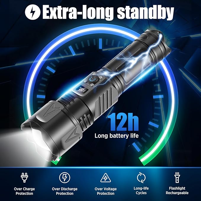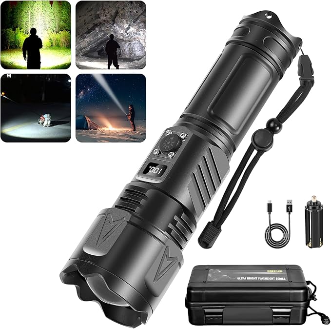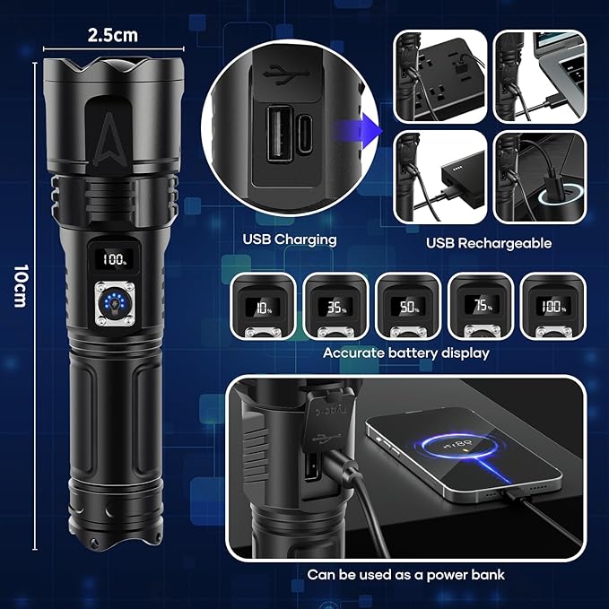 - 【UPGRADED RECHARGEABLE FLASHLIGHT & Type-C CHARGING | DIGITAL SCREEN FOR BATTERY USAGE】 The handheld flashlights has been completely upgraded to shorten the charging time and extend the service life, the working time is up to 5 hours on a single charge. The flashlights high lumens rechargeable can be charged by the Type-C cable, which allows you to charge the flash light more conveniently. The digital screen above the flashlight can help you know the battery usage clearly .