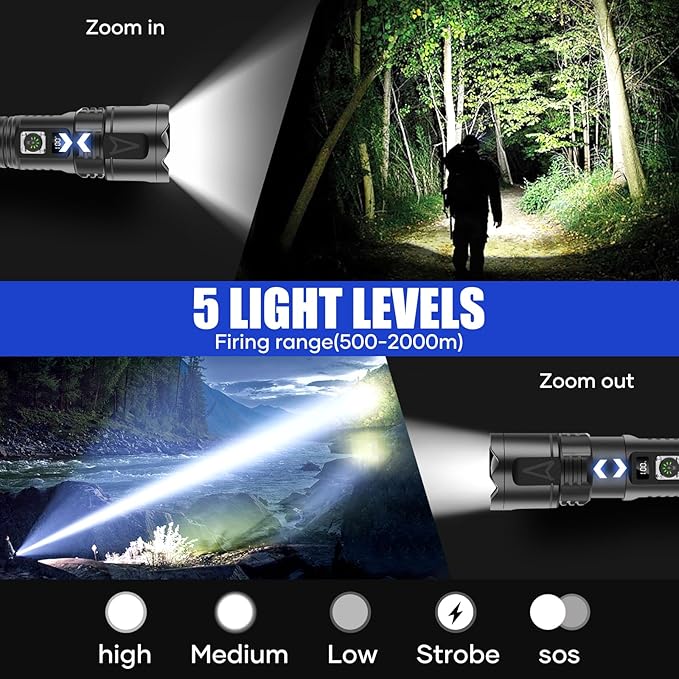 - 【2000 HIGH LUMENS FLASHLIGHTS】 This rechargeable high lumens flashlight are equipped with high quality chips, capable of emitting 2000 lumens on the highest power setting, its irradiation distance can reach 2000m. Almost all of your field of view can be turned into daylight. It is very suitable for camping, hiking, dog walking or any outdoor activities and emergency power-off backup.