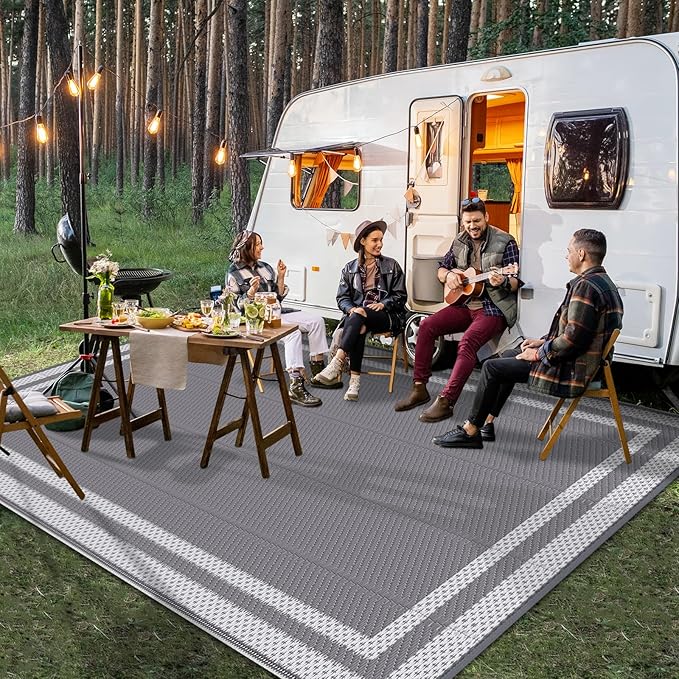 HappyTrends,Outdoor Rug,Patio Rug,Reversible Portable Plastic Straw Rug,Camping Rugs for Outside RV,Large Waterproof Area Rugs for Patio,Deck,Picnic,Porch,Balcony(6'x 9',White&Gray)