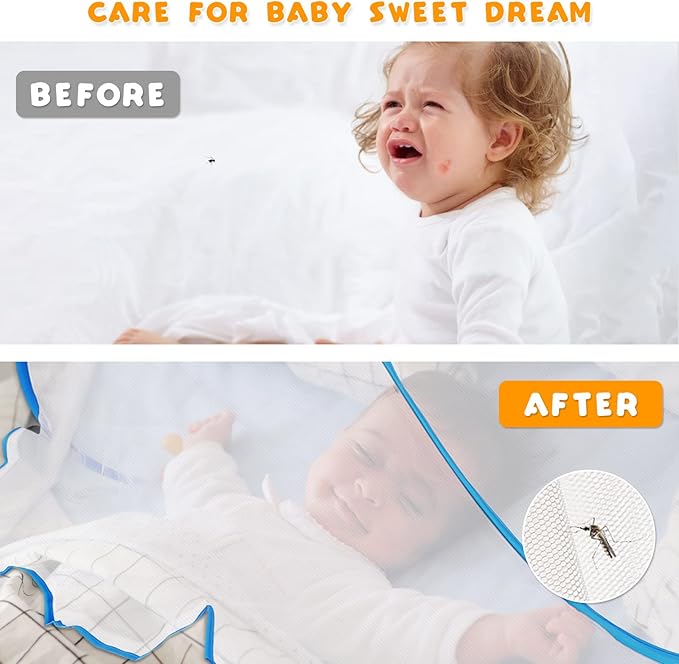 - 【Easy To Use】 No installation required, out-of-the-box. When you take it out of the bag, the pop up mosquito head net will automatically take shape without any installation operation. The mosquito net covers only the head and is recommended with a quilt. It can also provide full body protection to children up to 70 cm from mosquitoes