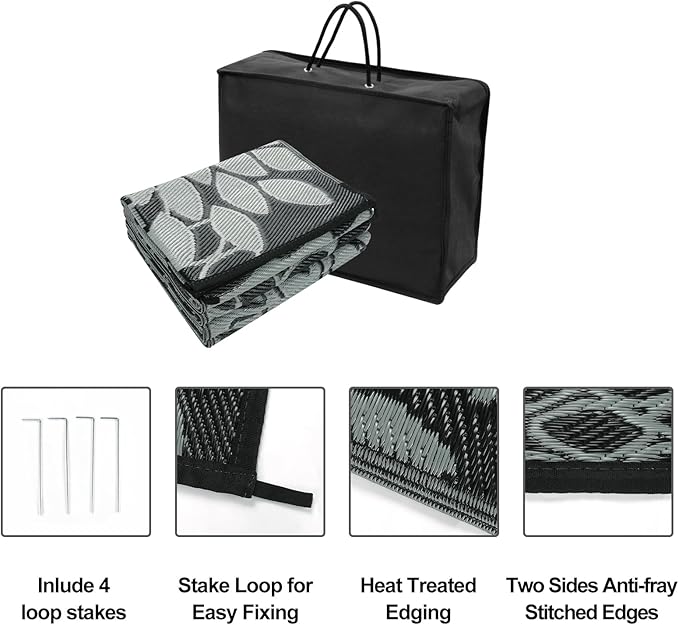 - Outdoor Plastic Straw Rug: The patio rug for clearance is manufactured from recyclable polypropylene material. It adopts the double-sided weaving process to make more enduring and breathable. Double Hemmed edges and reinforced corners prevent fraying and tearing.