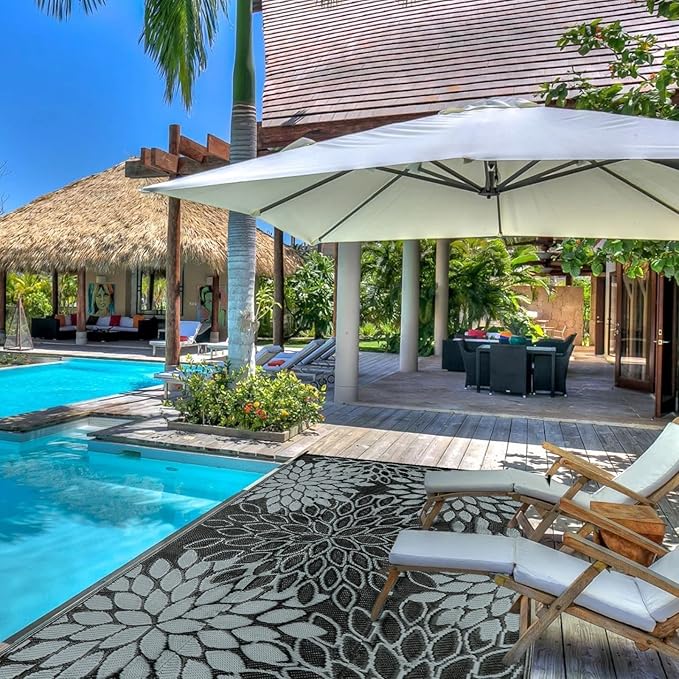 - Reversible Mat: Anidaroel waterproof outdoor carpet is designed with a double-sided pattern, either side of the mat will blend well with nature perfectly. The two shades of gray and white achieve the ultimate fusion. Tropical leaf pattern designs can create a comfy natural atmosphere for your indoor outdoor area.