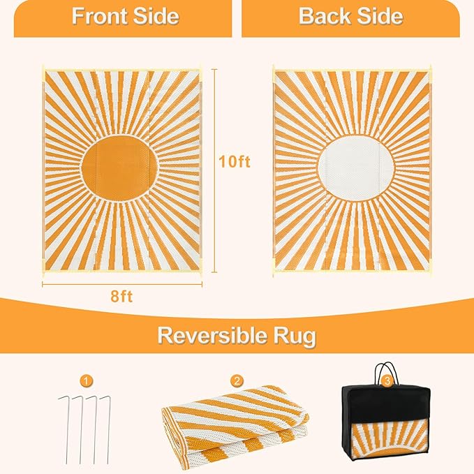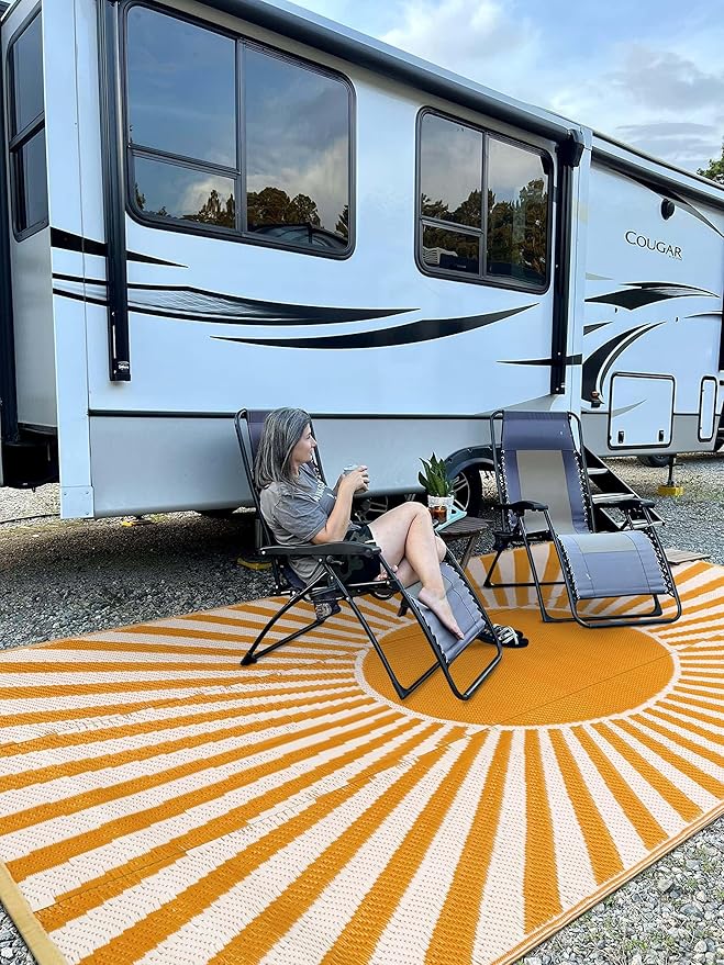 - [Versatile Outdoor Rug] The large outdoor rug is woven from a breathable, comfortable plastic material that won't damage your deck or lawn. Ideal for patio, deck, garden, backyard, balcony, camping, picnics, tent, RV road trips, beach and indoor rooms