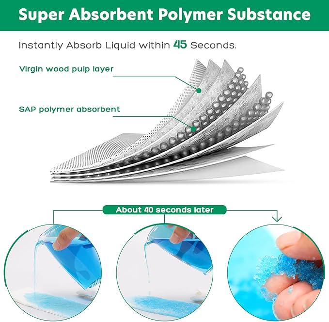 - Instantly Absorb Liquid within 45 Seconds - Our disposal urine bag is equipped with SAP water-absorbing polymer substance that can absorb urine, vomit, or other liquid waste and turns it into odorless, spill-proof gel. And it can instantly absorb the liquid into gel within 45 seconds.