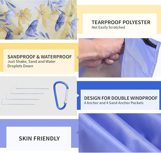 - 🌻【DESIGN FOR DOUBLE WINDPROOF】: Come with 4 metal stakes in a pouch for 4 anchor loops. Moreover, four integrated sand anchor pockets help keep the beach blanket on the ground even in high winds.