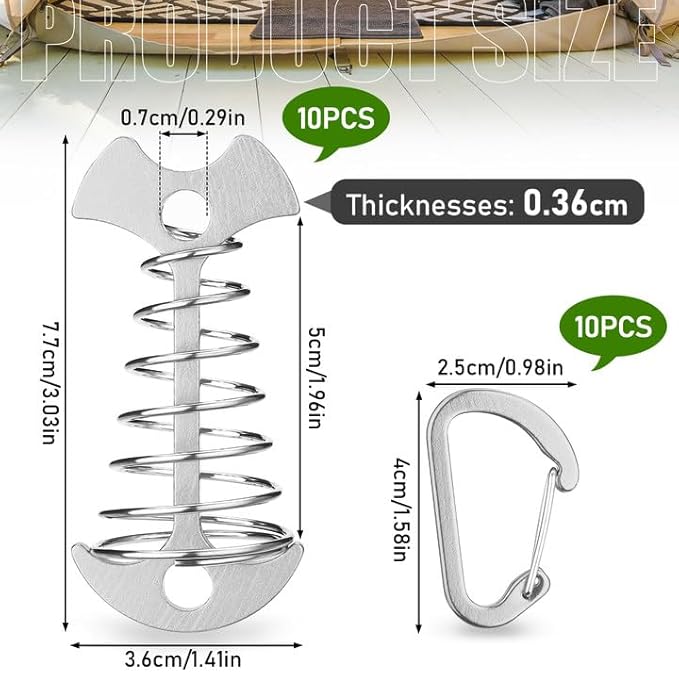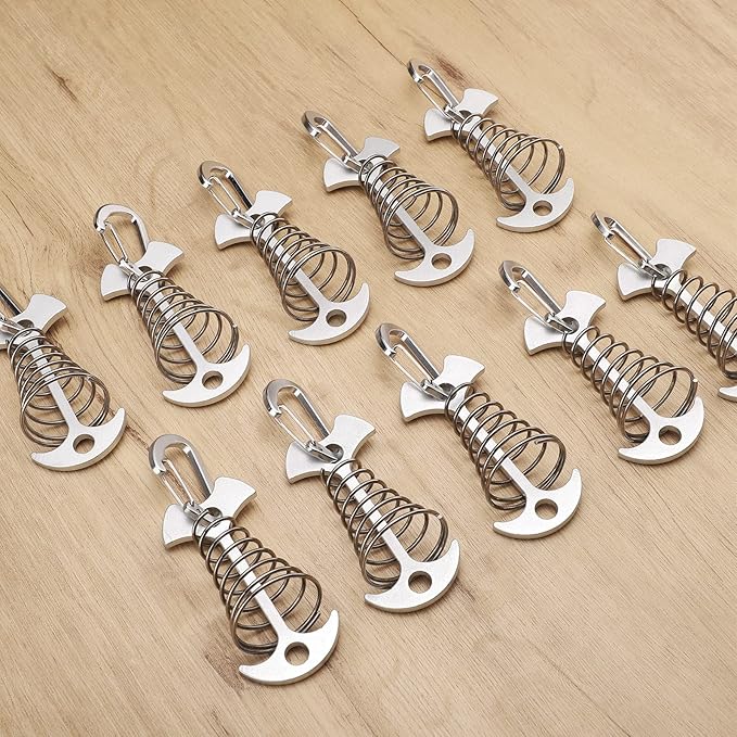 TOBWOLF 10PC Silver Deck Tie Down Anchors Fishbone Tent Pegs with Carabiners, Aluminum Tent Stakes Wind Rope Anchors Spring Deck Anchor Pegs Windproof Tent Rope Tightener Camping Outdoor Accessories