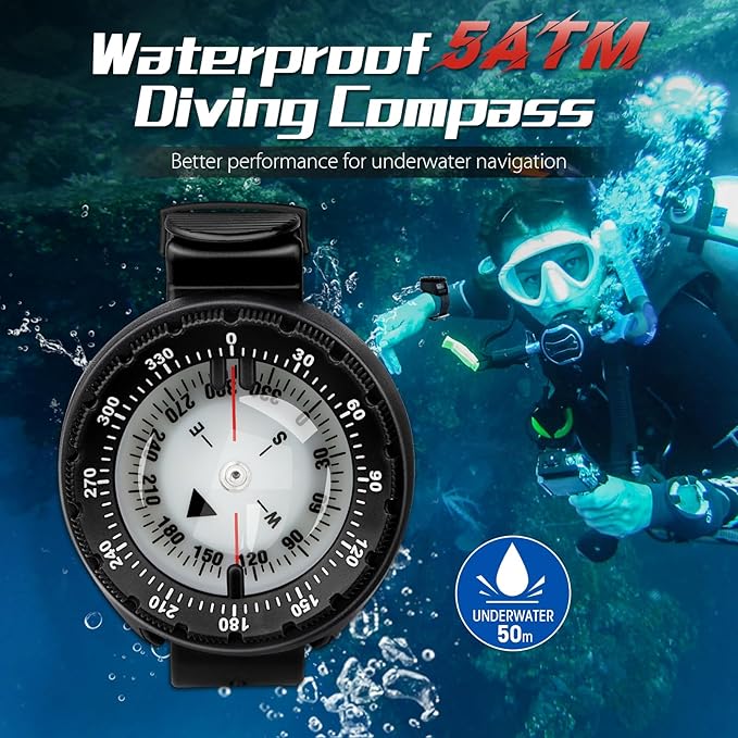 - SCUBA DIVING COMPASS - Our latest dive compass provides 50m waterproof performance for underwater navigation and includes a wide wrist mount strap to wear on your wrist while diving for hands-free navigation that's easily accessible.