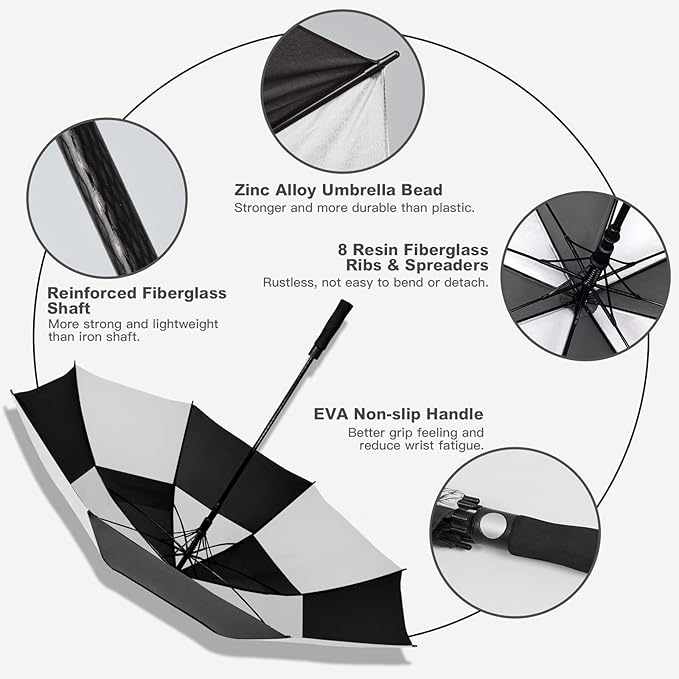 - Versatile: The Ultimate Golf Umbrella comes in 62/68/72-inch sizes and is designed with a reinforced structure for golf enthusiasts, business people and families. Whether it is daily life, business travel or sports and leisure, it can calmly cope with extreme weather such as rainstorm, strong wind and scorching sun, providing all-weather wind and rain protection for you and your family