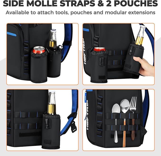 - Unique Function Design - Heytrip cooler backpack boasts a modular and expandable molle system, with front molle straps available for attaching tools, pouches, and modular extensions. The shoulder strap also features a bottle opener, so you can enjoy your favorite brews on-the-go. Additionally, the loop area on the top allows for personalization with a nametape, making your backpack even more unique and stylish.