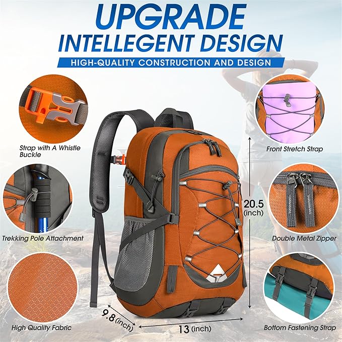 • 【Large Capacity&Multi Compartment】This portable hiking backpack has 40 liters of storage space with a multi-compartment design that includes 1 main zipper compartment, 2 zipper front pockets, 2 side pockets, and a waterproof wet pocket. The pen pocket and slip pockets in the front can help you organize your items more easily. The large capacity backpack helps you to easily storage all your essentials for your outing.