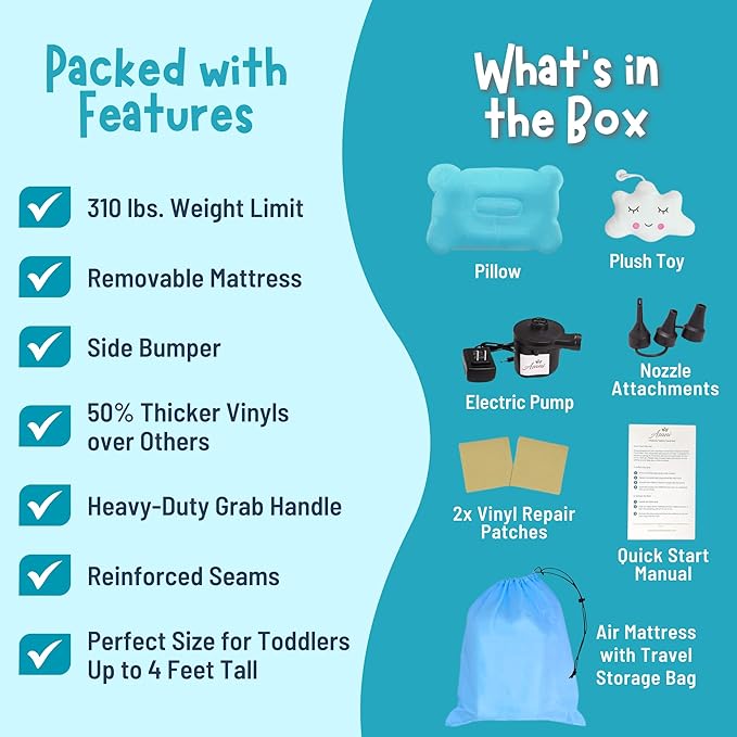 - ULTIMATE SLEEPOVER SET: Elevate your child's travel experience with Asani's all-in-one toddler bed. Includes electric pump, carry case, pillow, patching kit, and a cuddly stuffed animal. Portable design for secure and cozy sleepovers, ideal for travel, camping, or visits to Grandparents.