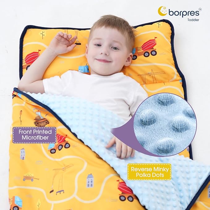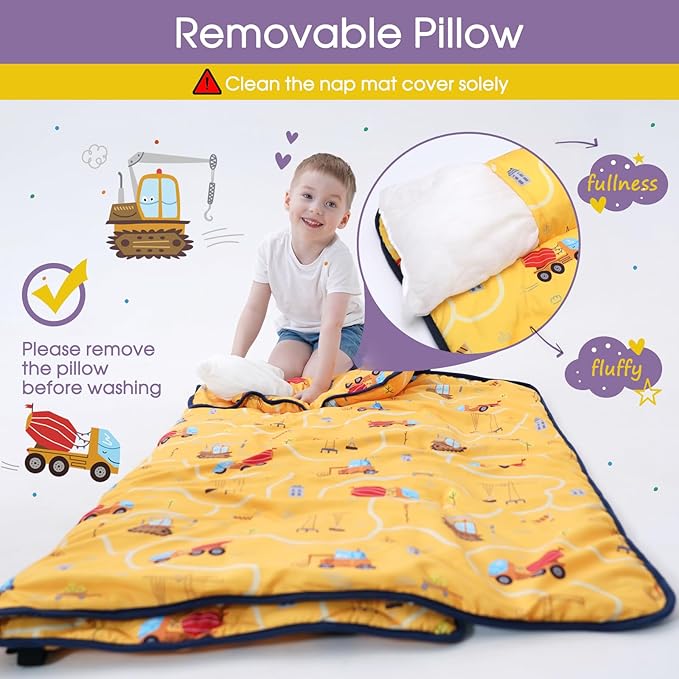- DETACHABLE PILLOW AND BLANKET SET: Designed with a removable pillow and blanket, this large nap mat for toddlers includes plush, minky dotted fleece materials, and is ideal for preschool, daycare, and everyday care. It offers easy washing and storage