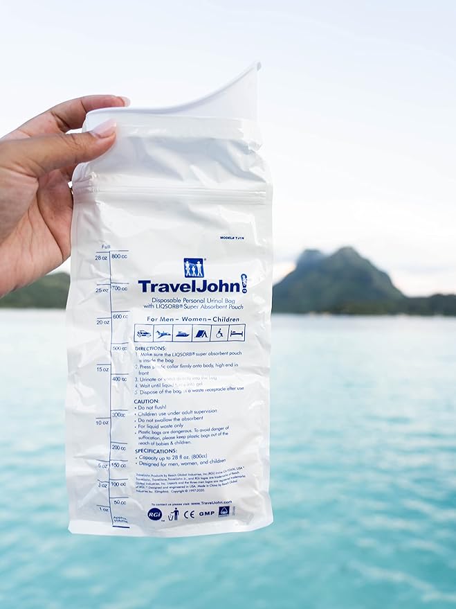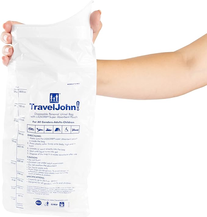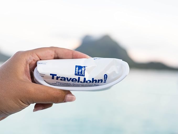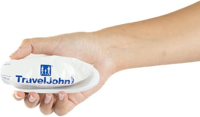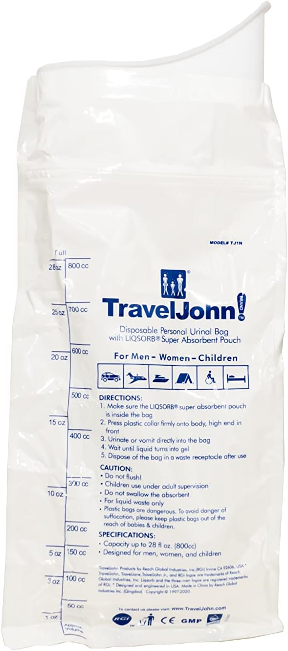 - All TravelJohn products feature a uni-sex design meant for all genders and ages. Designed to be used standing or sitting the spill guard prevents backflow during use. It also holds up to 28 fluid oz/800ml of liquid and is reusable until it's full.