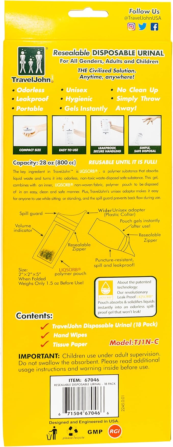 Resealable Disposable Urinal for All Genders, Adults, and Children (18 Pack) Designed for Emergencies, Travel, Camping, Long Car Rides and More - 28oz/800ml Capacity (TJ1N-C)