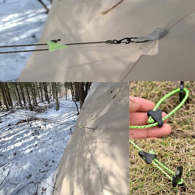 - Triangle tent rope adjustment buckle is made of environmentally friendly plastic, strong and durable, adjust the rope, non-slip stop, night luminous, after absorbing sunlight during the day can then self-luminous at night, luminous effect to avoid tripping over the tent at night, to protect camping safety.