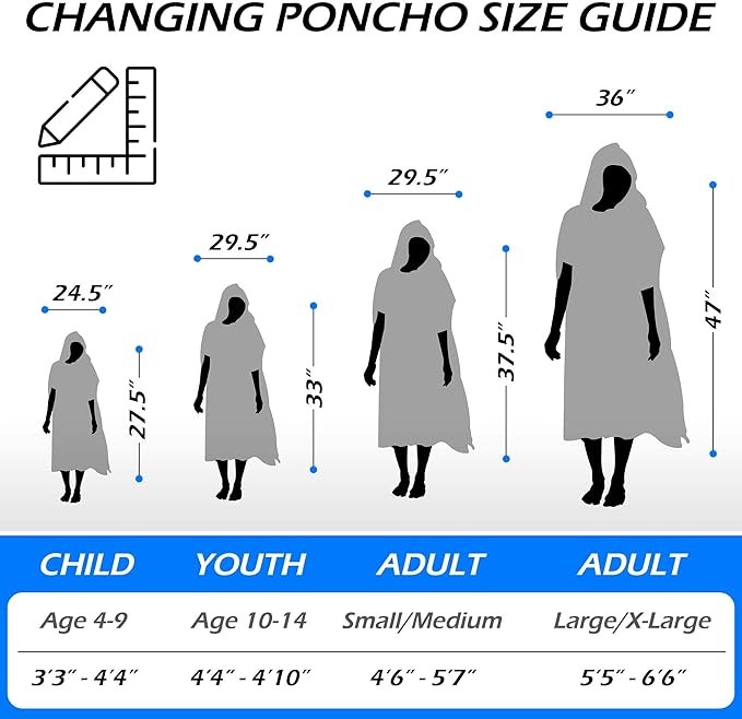 - Multiple Sizes changing beach poncho - 4 sizes for children to comfortable & oversized adult towel with hood makes changing underneath easy - See the Size Chart before Ordering