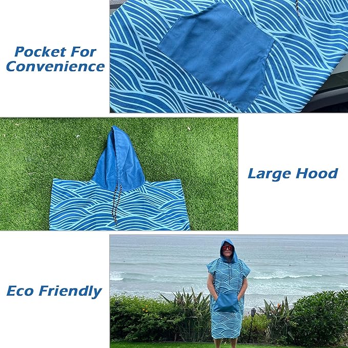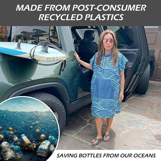 - Eco Changing Poncho is made from Post-Consumer Recycled materials - An absorbent towel for surfing or swimming to keep you cozy, warm, and dry - Swim Parka or Camping Towel and swim robe