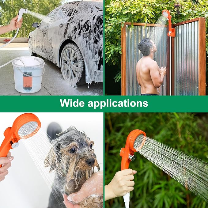 - ✅ Easy Assembly and Operation: WADEO camping shower is very easy to use, hold the switch on battery pack for over 3 seconds to start the pump. Equipped with a 3 selected modes shower head and water stop switch, you can easily switch different modes by rotating the handle on the shower head panel. The camping shower offers gentle and comfortable stream at 1.32 gal/min (5 L/min).