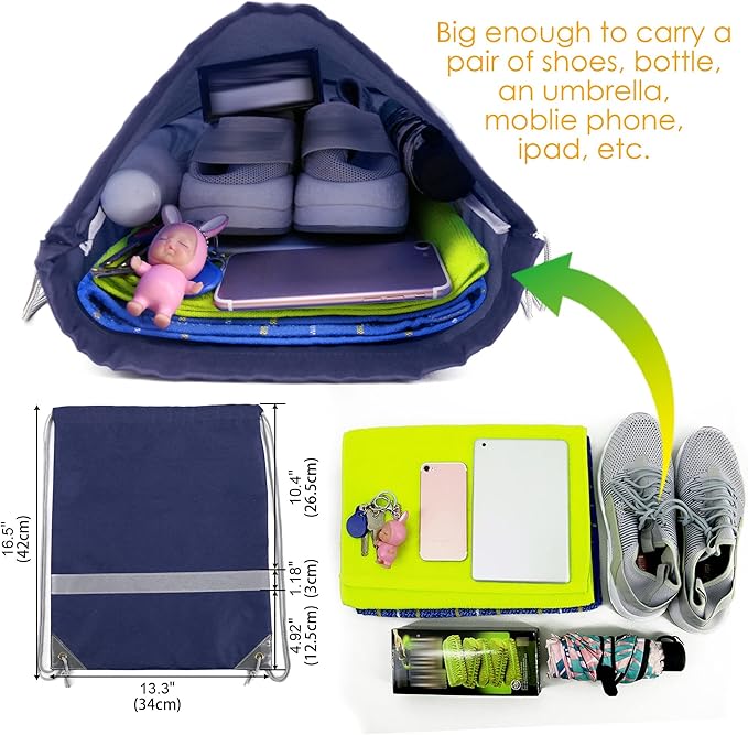 - 【LARGE CAPACITY & LIGHTWEIGHT】-- The drawstring backpack measures 16.5" x 13.4" and it is large enough to carry a pair of shoes, a bottle, an umbrella, lunch or clothes. These drawstring bags are made of high-density 210D polyester fabric. Lightweight and foldable, it is a good choice for home or travel. Provide you with a lot of convenience.