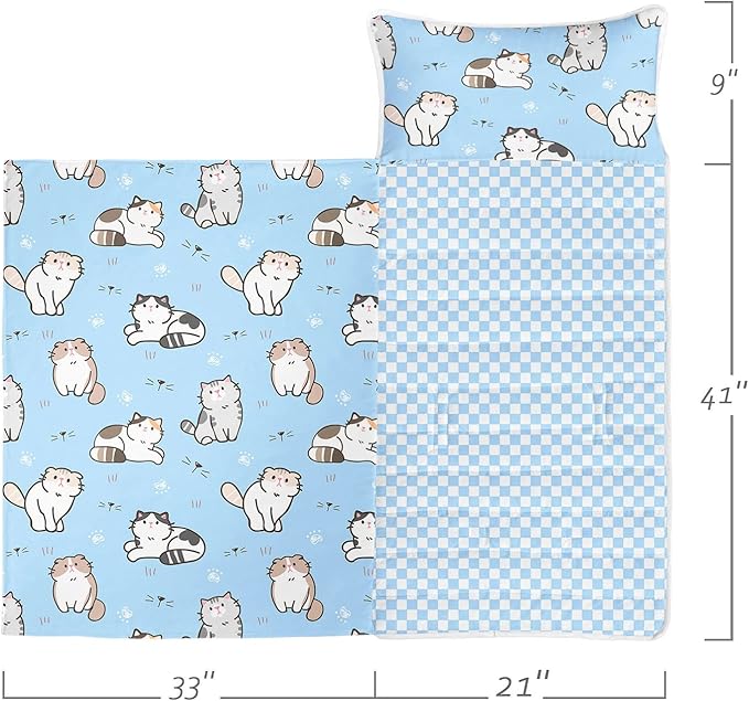 - Size - Nap mat measures 50“x21”x2“, comes with 21”x9" removable pillow. Attached blanket measures 41” x 33”. Suitable for children ages 3 to 7.