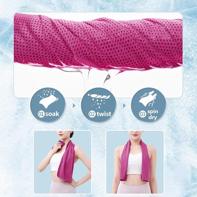 - ▶ Instant Cooling Towel & Stay Cool: This cooling towel has evaporative breathable mesh material makes it easy to activate the cooling towel when you simply soak, wring out and spin it. The cooling design uses moisture from the towel to draw the sweat away from your skin to keep you cool. The cool feeling can stay for several and reactivate the chilling by repeating the steps.