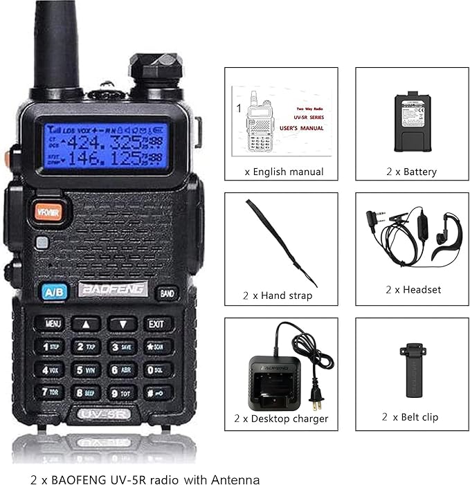 - What's in the package? 2 x BAOFENG UV-5R radio with antenna, 2 x 1800mAh Li-Ion battery, 2 x Headset, 2 x Desktop charger, 2 x Belt clip, 2 x Hand strap, 1 x English manual.