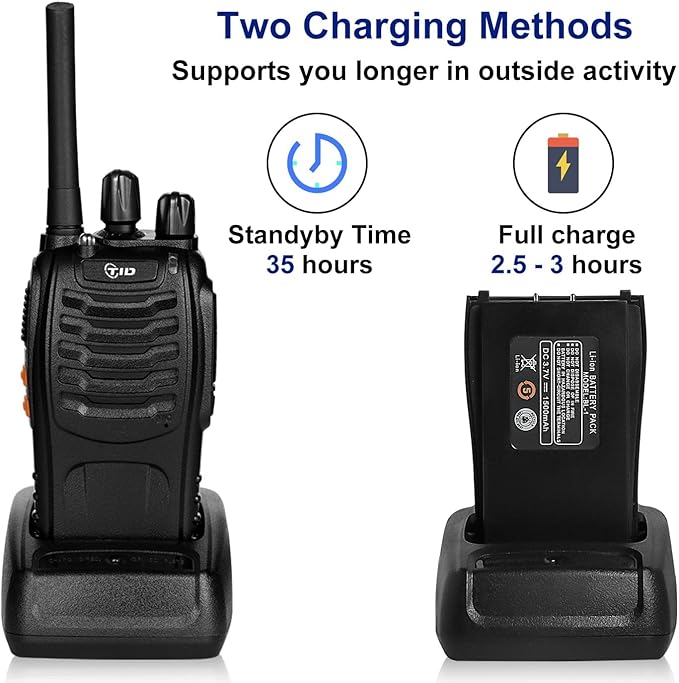 - 💎【Long-Lasting Battery Life】With a powerful 1500mAh battery, TD-V2 walkie talkies can keep you connected for up to 35 hours of continuous use. The durable battery ensure uninterrupted contact for camping, fishing, hiking or some business such as cruise ships, hotels, restaurants, supermarkets and train stations etc